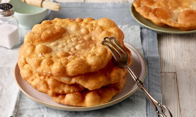 - Salz mit Knoblauch und Wasser gut vermischen. Die noch heißen Langos damit